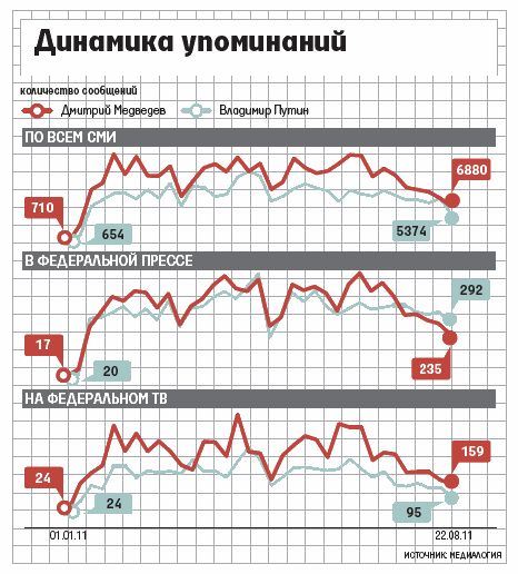 Изменилось и освещение их деятельности в СМИ, показывает исследование компании «Медиалогия». Начиная с 18 июля федеральная пресса стала больше писать о Путине, чем о Медведеве (в среднем на 50 сообщений в неделю), тогда как прежде о Медведеве писалось больше (см. график на www.vedomosti.ru). В целом во всех СМИ число упоминаний о двух руководителях страны к началу августа сравнялось, хотя ранее в 2011 г. разница достигала 5000 сообщений в неделю в пользу Медведева. Это уже тенденция, полагает представитель «Медиалогии» Надежда Жуковская.