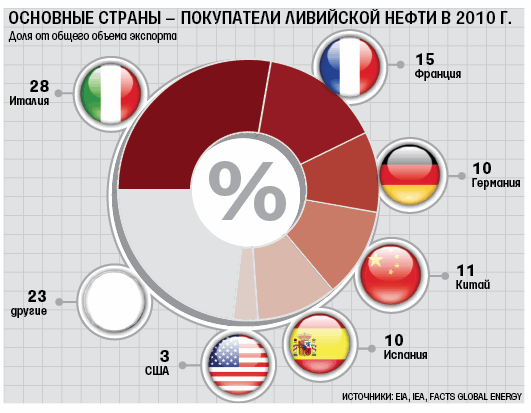 Бюджет Ливии практически полностью зависит от экспорта нефти, который в 2010 г. составил около $47 млрд (на страну пришлось примерно 2% мирового производства нефти). В Ливии работали все крупнейшие мировые корпорации – BP, Royal Dutch Shell, Eni, Total, Occidental Petroleum, ConocoPhillips, OMV, Wintershall. По данным UNCTAD, прямые иностранные инвестиции в Ливию в 2009 г. составили $15,5 млрд.