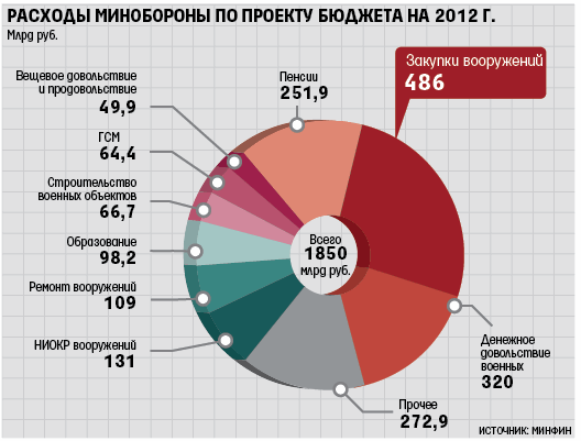 Расходы на закупку, ремонт и разработку вооружений в опубликованном проекте бюджета отсутствуют. Однако в прошлом году председатель комитета Госдумы по обороне Виктор Заварзин сообщал, что эти расходы на 2012 г. планируются в размере 726 млрд руб., в том числе на закупку новых вооружений – 486 млрд руб., НИОКР – 131 млрд руб. и ремонт и модернизацию – 109 млрд руб. Премьер Владимир Путин заявил в июле, что эти расходы будут даже больше – 750 млрд руб. Кроме того, вне бюджета 2012 г. учитываются его гарантии по банковским кредитам предприятиям оборонки на сумму 175,95 млрд руб., правда, из 180 млрд руб. госгарантий на 2011 г. до сих пор выбрано меньше половины.