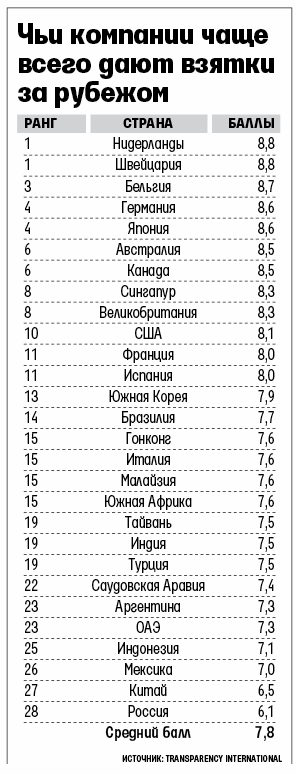 Россия заняла последнее место в опубликованном вчера индексе взяткодателей, подготовленном Transparency International. Эксперты оценили, насколько часто компании 28 крупнейших экономик дают взятки за границей (см. таблицу). Для этого они опросили руководителей 3016 холдингов. Оценка 0 баллов означает, что компании всегда дают взятки, 10 – никогда.