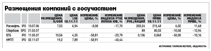 Из компаний, включенных в программу приватизации на 2011–2013 гг., а также в проект поправок к ней (есть у «Ведомостей»; см. врез на стр. 11), размещение провели «Роснефть», ВТБ, Сбербанк и Новороссийский морской торговый порт (НМТП; госдоля – 20%). Акции трех последних компаний сейчас значительно дешевле, чем при размещении (см. таблицу): ВТБ и НМТП – на 59%, Сбербанка – на 10%. Бумаги «Роснефти» в долларах дешевле на 8%, чем при IPO в 2006 г., а в рублях – дороже на 6%. Представители НМТП и банков комментировать идею Сечина отказались, их коллега из «Роснефти» был недоступен.