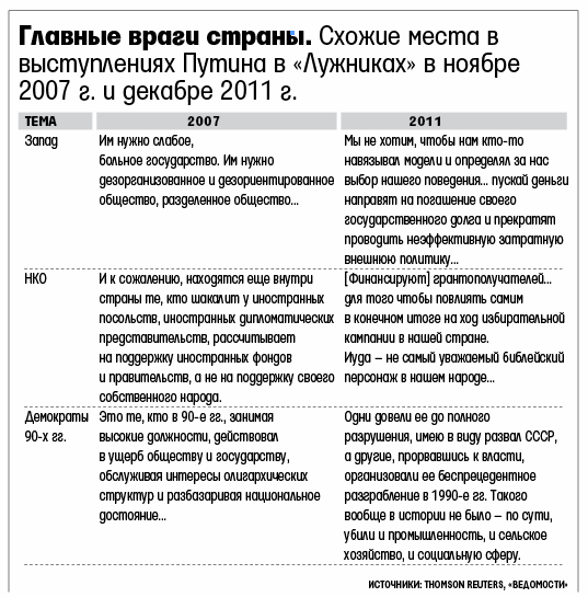 Накануне съезда ожидалось, что Путин объяснит, как он видит развитие страны в ближайшие шесть лет. И действительно, вчера действующий председатель правительства коснулся внешней и внутренней политики, социальной тематики, взаимоотношений с бизнесом. Речь его – особенно в части, касавшейся противников, – повторяла по смыслу, стилистике и даже терминологии (см. таблицу) выступление в «Лужниках» в конце ноября 2007 г. Тогда Путин возглавлял предвыборный список «Единой России», а партийцы агитировали голосовать на выборах Госдумы за Путина как гаранта стабильности.