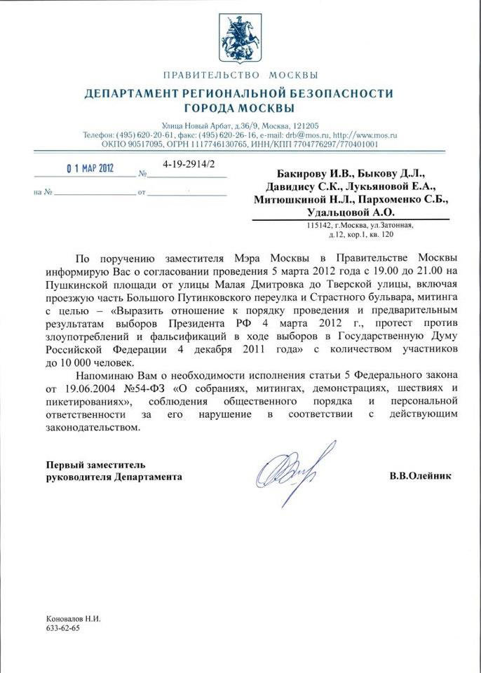 Эту информацию подтвердил заммэра столицы Александр Горбенко: «Мы договорились, что в 19.00 5 марта заявители проведут митинг на Пушкинской площади и прилегающей территории. Будет перекрыто движение возле «Известий» и галереи «Актер» (цитата по «РИА Новости»). По его словам, на ступенях кинотеатра «Пушкинский» будет организована импровизированная сцена. Он уточнил, что в случае переполнения территории будет «вырезана» одна полоса на Тверской улице, а в случае необходимости будет перекрыта Тверскую. Заявленное количество участников - 10 000 человек.