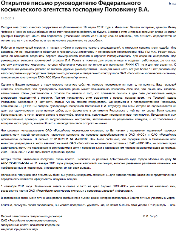В среду на сайте РКС появилось "открытое письмо", подписанное первым заместителем гендиректора компании Иваном Голубом и адресованное Поповкину. Автор письма предъявил главе Роскосмоса ряд претензий общего характера, обвинил в незаконной проверке РКС и упомянул «сообщение о пьяной драке» с участием чиновника.