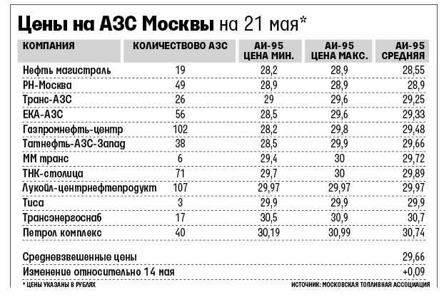 По данным Московской топливной ассоциации, на заправках «Лукойл-центрнефтепродукта» средняя цена литра Аи-95 к 21 мая вплотную подобралась к опасной отметке – 29,97 руб. У сети «ТНК-столица» чуть ниже – 29,89 руб., но заправки BP, управляемые «дочкой» ТНК-ВР «Петрол комплекс», продают бензин в среднем за 30,74 руб. Правило Артемьева нарушает и небольшая сеть «Трансэнергоснаба» – 30,7 руб. По данным представителя ФАС, по состоянию на 23 мая четыре крупнейшие московские сети – «Газпром нефти», ТНК, «Лукойла» и «Роснефти» – норматива в 30 руб. не превысили.