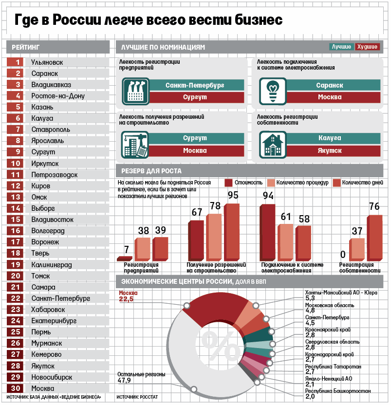 Страны в глобальном рейтинге представляют города с наибольшим вкладом в ВВП – как правило, это столицы. Если бы Россию представляла не Москва, ее место было бы выше. Например, если бы простоту подключения к электричеству России определял Саранск, то она была бы 154-й, впереди Канады. По простоте получения разрешения на строительство Россия на 178-м месте: в Москве для этого надо пройти 47 процедур, что занимает 392 дня и стоит 171,5% среднедушевого дохода. Сургут мог бы переместить Россию на 82 ступени вверх: там всего 17 процедур, отнимающих 150 дней.