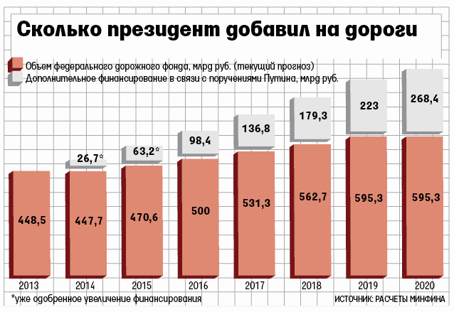 Минфин готов увеличить ассигнования на дорожное хозяйство на 26,7 млрд руб. в 2014 г. и 63,2 млрд в 2015 г., рассказали два федеральных чиновника. Тогда удастся выполнить поручения Путина из его первых указов и предвыборных статей, объясняет сотрудник аппарата правительства.