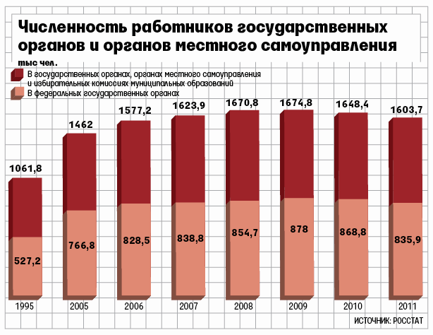 «На фоне того, как в процентном соотношении увеличилась численность администрации президента, увеличение госслужащих министерств незначительно», – полагает сотрудник аппарата правительства. С приходом Медведева численность работников министерств и ведомств вырастет на 435 человек – это утверждено правительством, говорят два федеральных чиновника. Одна из причин роста – реорганизация. Например, из-за разделения Минздравсоцразвития на два министерства – здравоохранения и труда и социальной политики – их штатная численность выросла на 70 человек.