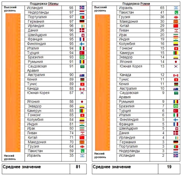 Единственная страна, где большинство населения отдают предпочтение Ромни, - Израиль, где за республиканца готовы проголосовать 65% населения. На втором месте по числу почитателей Ромни - Пакистан (41%), на третьем - Грузия (36%).