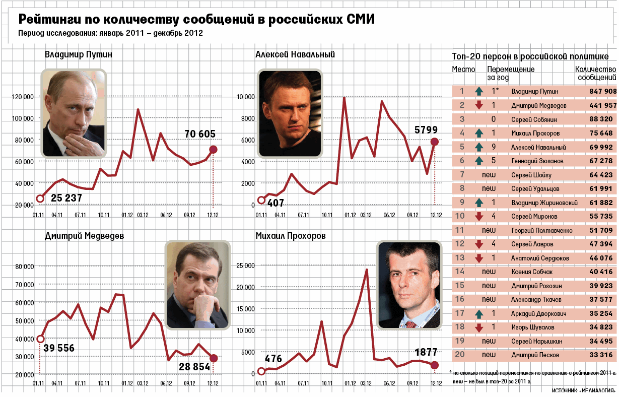 Путин и Медведев, по данным «Медиалогии», оставили далеко позади всех остальных в списке: занявший и в 2011, и в 2012 гг. 3-е место мэр Москвы Сергей Собянин упоминается в СМИ и блогах в разы реже: 115000 и 88000 соответственно. Кроме самого Путина в двадцатку-2012 вошел его пресс-секретарь Дмитрий Песков (№20) с 33000 сообщений – абсолютное большинство их было посвящено разъяснению позиции президента.