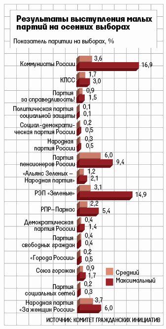Лучше других новичков выступили левые партии, а также экологические, что, по мнению авторов доклада, может свидетельствовать о запросе общества на такие партии. Эту версию отчасти подтверждает и корреляция результатов КПРФ и партий с похожими названиями – «Коммунисты России», КПСС: она не так велика, чтобы считать их просто спойлерами, отметили эксперты. При этом явка в большей части регионов оказалась ниже или равна показателю предыдущего голосования (в том случае, если оно в 2007 г. не было совмещено с выборами в Госдуму): новые партии не привели на участки новых избирателей. Особенно слабо предложение на правом фланге – партия Михаила Прохорова фактически безжизненна.