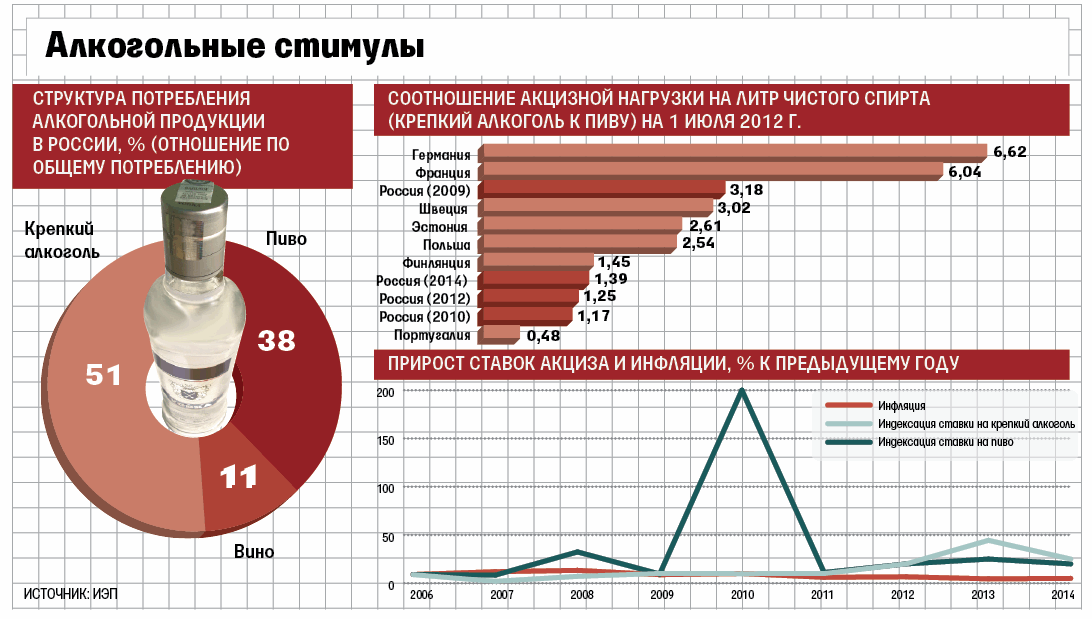 Но в России акцизная нагрузка на пиво и крепкий алкоголь в пересчете на литр чистого спирта отличается всего на 25%. Еще в 2009 г. уровень налогообложения крепкого алкоголя и пива отличался почти втрое, указывает завлабораторией бюджетной политики Института Гайдара Илья Соколов: доля крепкого алкоголя в структуре потребления снизилась с 80% в 1995 г. до 51% к 2010 г., а пива – выросла с 14 до 38%. Но в 2010 г. ставки акциза на пиво были повышены втрое, и фискальная нагрузка практически сравнялась с крепким алкоголем. Исчезли «ценовые сигналы к переключению на слабоалкогольную продукцию», подчеркивает Соколов.