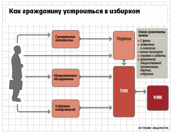Наиболее надежный способ стать членом УИК (см. схему) – получить направление от партии. Сдать документы проще всего при посредничестве организаций, которые набирали добровольцев в наблюдатели на выборах депутатов Госдумы и президента в 2011–2012 гг., – «Гражданина наблюдателя», «Сонара», «Голоса», «Росвыборов», Союза наблюдателей России, у них общая база данных, рассказал координатор проекта от союза Михаил Успенский. По его оценке, через все эти организации уже подали заявления около 3700 человек, в том числе 2100–2400 москвичей (в столице более 3600 УИК).
