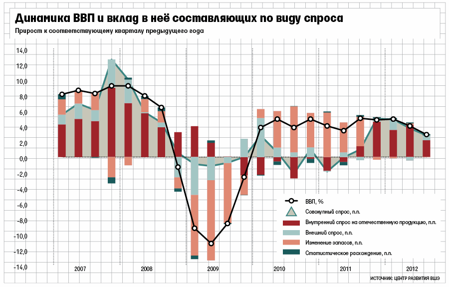 Внутренний спрос – основная опора роста экономики (см. график), но его темпы замедляются, а вместе с ними и экономика: по оценке Минэкономразвития, в 2012 г. рост составил 3,6% против 4,3% годом ранее. В то же время для выполнения бюджетных обязательств России необходимы темпы не ниже 4%, посчитали в Минэкономразвития. Премьер Дмитрий Медведев, выступая на Гайдаровском форуме, поднял планку еще выше, заявив основной целью правительства на ближайший период обеспечение устойчивой траектории роста не ниже 5%.