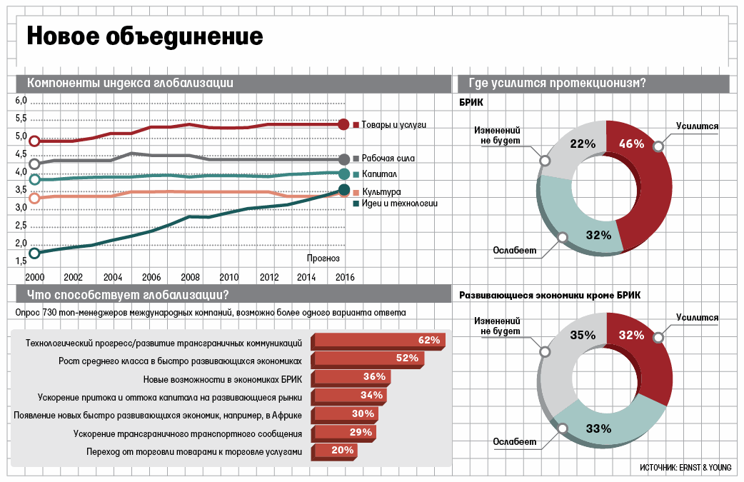 Глобализация продолжается, но она стала иной, предупреждают эксперты EY в обзоре: это уже не просто международная торговля и потоки капитала. Глобализация превращается в обмен идеями и технологиями, свидетельствует индекс EY (см. инфографику), который будет представлен на Всемирном экономическом форуме в Давосе.