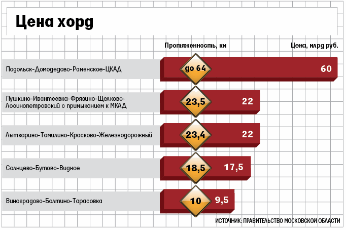 Московская область попросила федеральное правительство выделить 35 млрд руб. на строительство дорог, сообщил и.о.губернатора Андрей Воробьев: пяти хорд, «которые позволят, например, соединить аэропорты «Внуково» и «Домодедово», не заезжая в Москву» (см.график). По словам Воробьева, инициатива «получила понимание и поддержку» на совещании у премьера Дмитрия Медведева по развитию Московского транспортного узла 11 января. Об этом знает один из участников совещания.