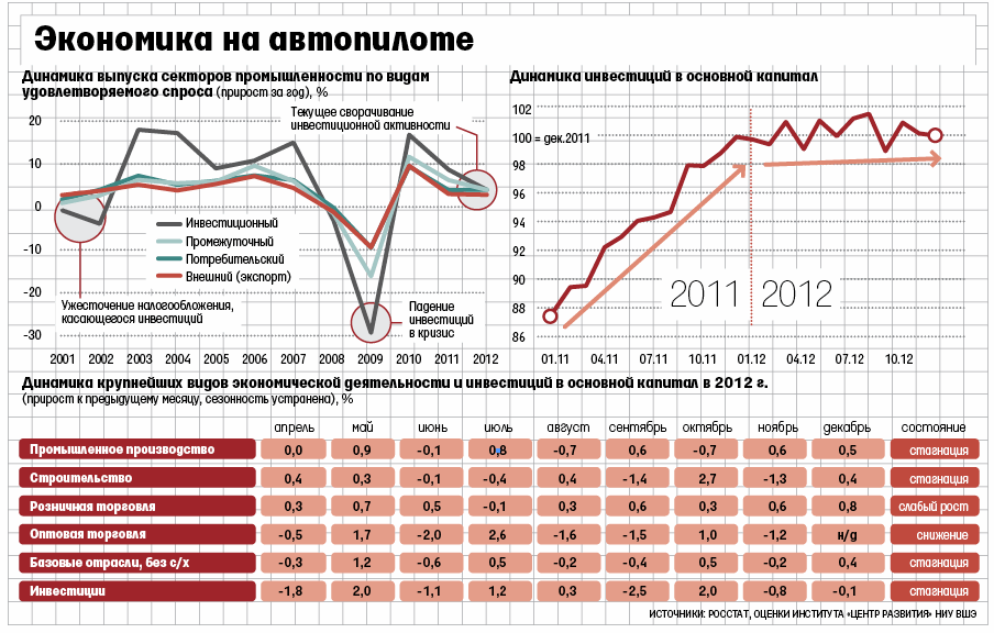 В 2012 г. произошло почти беспрецедентное падение темпов роста производства инвестиционной продукции, инвестиции стагнировали на протяжении года (рост на 6,7% – «заслуга» внутригодовой динамики в 2011 г.), замечает Николай Кондрашов из Центра развития ВШЭ. Упали и темпы роста строительства – до 2,4% с 5,1% в 2011 г., а рост в базовых отраслях, замедлившийся до 3,2% с 5,1%, при сохранении текущей динамики составит по итогам 2013 г. всего 1,4%. Поддерживавший экономику потребительский спрос тоже будет замедляться, так как сам был в 2012 г. поддержан индексацией зарплат силовикам и ускорением потребкредитования (темпы его роста в 40% чрезмерны, согласен Клепач с ЦБ): никаких причин для ускорения экономики нет. Главным условием роста становится качество госуправления: борьба с коррупцией и институциональные реформы – именно так ответили 79% опрошенных на Давосском форуме, напоминает Кондрашов. Однако с учетом того что премьер Дмитрий Медведев к такому ответу не присоединился, шансы на оживление экономики в этом году совсем иллюзорны, заключает он.