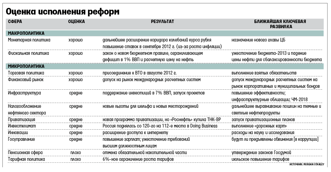 Спустя год после переизбрания Владимира Путина президентом Morgan Stanley провел ревизию исполнения его предвыборных обещаний. Президент заявил амбициозную программу экономических реформ, напоминают аналитики Morgan Stanley Джейкоб Нелл и Алина Слюсарчук: сбалансированный бюджет и низкая инфляция, повышение конкурентоспособности и инвестиций, создание «высокотехнологичных рабочих мест» – все, чтобы обеспечить экономике рост на 5–6%. В четырех из 12 сфер ход реформ получил оценку «хорошо», в шести – «средне» и в двух – «плохо» (см. таблицу на стр. 04).
