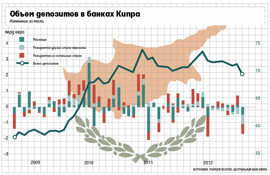 В субботу источник в правительстве Кипра сообщил Reuters, что Никосия достигла соглашения с тройкой кредиторов по налогу на банковские депозиты. Для вкладов от 100 000 евро в крупнейшем банке – Bank of Cyprus – планировалось ввести 20%-ный налог, в остальных – 4%-ный. Но кредиторов это не устроило. «Что если ввести налог на депозиты Bank of Cyprus, а через две недели он все равно обанкротится – с чем мы останемся?» – сказал WSJ высокопоставленный чиновник ЕС. Киприоты лишь разводят руками. «Как только удается договориться о чем-то, тройка придумывает что-то еще», – сетует кипрский чиновник.