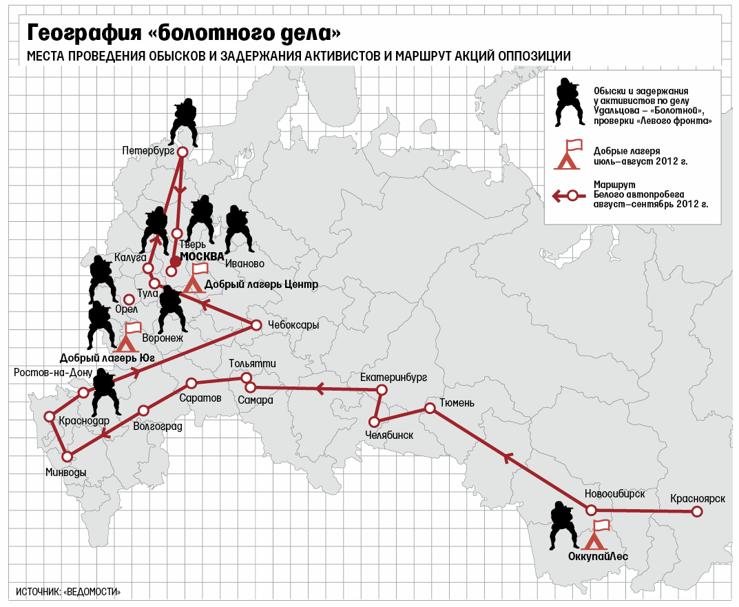 География обысков по «болотному делу» во многом совпадает с очагами активности «Левого фронта». В эпицентре расследования – Сергей Удальцов