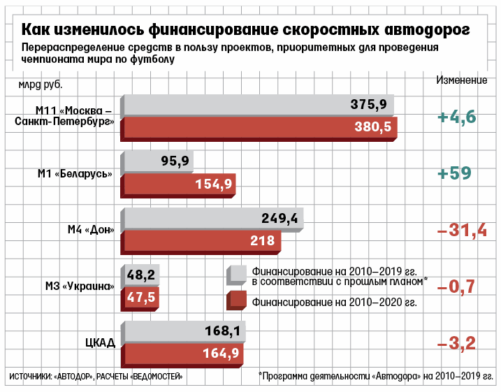 Отныне усилия компании будут сосредоточены на двух трассах – новой дороге М11 от Москвы до Санкт-Петербурга и М1 «Беларусь». Обе они должны заработать до начала чемпионата мира, а не в 2019 г., как предполагалось ранее.