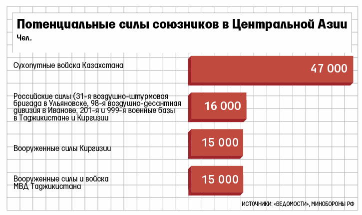 По словам источника в российском Минобороны, вывод войск международных сил по стабилизации в Афганистане (ISAF) в 2014 г. (их основу составляют контингенты США и стран НАТО) может привести к наиболее актуальной на данный момент угрозе для российских союзников в Центральной Азии, а значит, и для России. Поэтому подготовка силовых контрмер на случай обострения обстановки в Центральной Азии после весьма вероятной победы талибов в Афганистане и притока свежих сил экстремистов из Сирии и других арабских стран является одной из главных забот для России в сфере военной безопасности. Фактически на решение этих задач нацелены войска Центрального военного округа (ЦВО) и Воздушно-десантных войск (ВДВ), а также Силы специальных операций, командование которых создано в прошлом году, отмечает собеседник «Ведомостей».