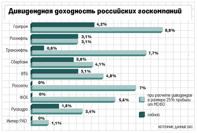 По распоряжению правительства от 12 ноября 2012 г., госкомпании должны направлять на дивиденды минимум 25% чистой прибыли по РСБУ, но правительство вправе уменьшить выплаты для отдельных предприятий. Вице-премьер Аркадий Дворкович заявлял, что дивидендная политика может быть смягчена для госкомпаний, реализующих крупные инвестиционные проекты, а предприятия с высоким долгом могут быть и вовсе освобождены от выплаты дивидендов.