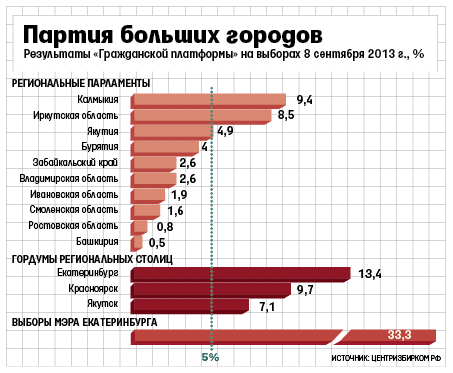 Партия Прохорова находится в анабиозе, поясняет эксперт по региональным выборам Александр Кынев: в прошлом году были точечные прорывы на выборах в Иркутской области, Якутии, Калмыкии (см. график), но кадровая политика очень неудачная: «У проекта проблемы на региональном уровне: набрали одиозных людей - бывших единороссов и членов ЛДПР, но таких, как Евгений Ройзман (мэр Екатеринбурга. - «Ведомости»), больше нет». По мнению Кынева, партия не смогла найти себя на фоне постоянно меняющейся политической обстановки, им не хватило драйва, свой шанс «Гражданская платформа» упустила в прошлом году, когда началась кампания против мэра Ярославля Евгения Урлашова и его не смогли вытянуть.