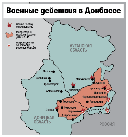 Вчера на окраинах Донецка и Луганска продолжались бои и перестрелки. Об этом сообщали как представители самопровозглашенных Донецкой и Луганской народных республик (ДНР и ЛНР), так и представители штаба украинской «антитеррористической операции» (АТО). По сообщению пресс-центра АТО, украинские войска заняли города Северодонецк и Попасную и продолжают бои за Лисичанск. В свою очередь пресс-служба ЛНР сообщила, что ополченцы покинули Попасную, Рубежное, Северодонецк и Лисичанск, «оставив спецподразделения для диверсионной работы в тылу врага». Аэропорт Донецка, как сообщил источник «Ведомостей», близкий к руководству ДНР, украинскими войсками деблокирован. При этом продолжаются бои и с частично блокированной у российской границы группировкой украинской армии - вчера бои продолжались в районе украинского пограничного перехода Мариновка.