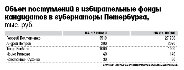 В избирательный фонд кандидата в губернаторы Петербурга Георгия Полтавченко, по данным горизбиркома на 31 июля, поступило 27,8 млн руб. Это почти в 14 раз больше, чем у кандидата от партии «Родина» Андрея Петрова, который по размеру поступлений в избирательный фонд находится на 2-м месте (см. таблицу). За две недели фонд Полтавченко вырос на 22,2 млн руб., фонд Петрова - на 1,9 млн руб.