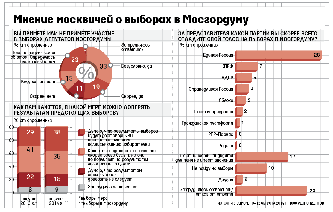 По данным свежего опроса ВЦИОМа, о предстоящих 14 сентября выборах в Мосгордуму знают 83% москвичей (о выборах мэра Москвы летом 2013 г. были информированы 90% опрошенных), но 66% пока ничего не слышали о кандидатах по своему округу. Прийти на участки планируют 52% москвичей (см. график): в прошлом году голосовать хотели 78%, но реальная явка составила всего 32%, напоминает ВЦИОМ. Выборы мэра были более конкурентными и острыми, а желание прийти и сам факт участия - разные вещи, поэтому, если исходить из прошлого опыта, стоит ожидать гораздо более низкой явки, комментирует руководитель управления политических исследований ВЦИОМа Степан Львов.