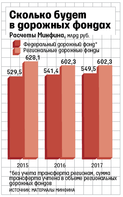 Федеральный дорожный фонд тоже не сократится: его базовая часть, которая формируется за счет ассигнований бюджета, будет увеличена, чтобы покрыть все компенсации регионам. По расчетам Минфина, на это требуется почти 509 млрд руб. за три года (сумма растет со 151 млрд в 2015 г. до 184 млрд в 2017 г.), знает федеральный чиновник.