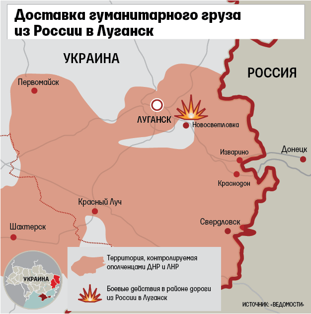 После того как на прошлой неделе стало понятно, что российский конвой пойдет не через подконтрольную украинскому правительству территорию Харьковской области, а через Донецк - Изварино (контролируемый с украинской стороны силами самопровозглашенной Луганской народной республики (ЛНР), украинская армия начала наступление под Луганском. Бои с ополченцами затронули дорогу, по которой помощь могла быть доставлена в Луганск (см. карту). Хотя представитель СНБО заявлял об окружении Луганска, в реальности ситуация там напоминает «слоеный пирог», но доступ в город по главной дороге со стороны России действительно прерван, говорит человек, близкий к руководству самопровозглашенной ЛНР. Не доставлена в сам Луганск, по словам собеседника «Ведомостей», и гуманитарная помощь со стороны украинского правительства - самым близким к городу пунктом, куда она поступила, стал давно занятый правительственными войсками пригородный поселок Металлист. Электричества и питьевой воды почти во всем Луганске нет уже фактически полмесяца (при температуре более 30 градусов). По данным управления ООН по координации гуманитарных вопросов, за вторую неделю августа из Донецка и Луганска бежало более 22 000 жителей в сравнении с 6200 за первую неделю.