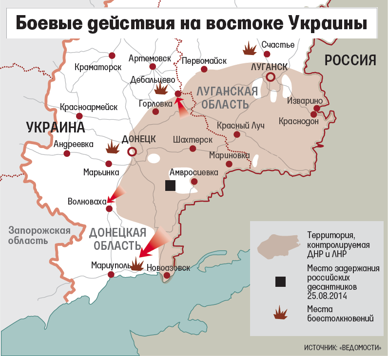 В четверг представитель Совета национальной безопасности и обороны Украины признал, что украинские силы оставили Новоазовск - городок на Азовском море у границы с Россией. В реальности первые отряды повстанцев у Новоазовска появились еще в понедельник, а сам город был занят силами самопровозглашенной Донецкой народной республики (ДНР) в среду, говорит человек, близкий к руководству ДНР. В то же время силы ДНР пока не заняли райцентр Волноваха на пути из Донецка в Мариуполь, говорит он. Это подтвердил «Ведомостям» и житель Волновахи Петр.