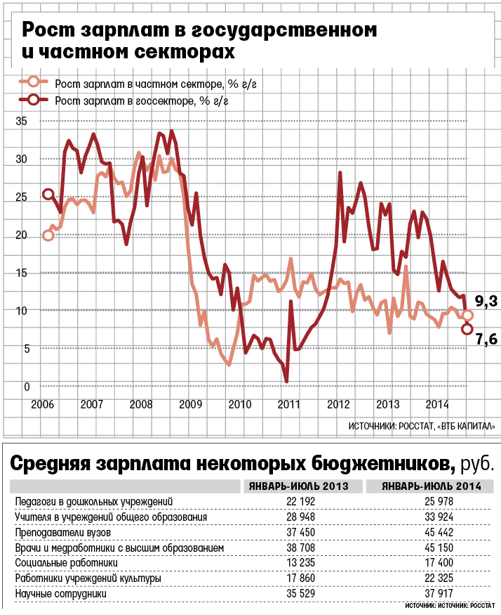 Однако сами параметры указов зависят от динамики средней зарплаты, в том числе в частном секторе, а она будет расти медленно, отмечает Акиндинова. Торможение экономики и роста зарплат уже помогает экономить, говорил чиновник Минфина. Уже в 2014 г. расходы регионов на указы по росту зарплат увеличатся не на 189 млрд руб., а на 101 млрд, оценивал он в середине августа.