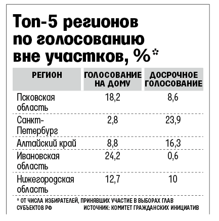Основным способом накрутки голосов, по мнению экспертов КГИ, стало голосование вне избирательных участков - досрочно и на дому. Больше всего претензий в связи с искусственным повышением явки за счет этих видов голосования предъявлялось властям Санкт-Петербурга, Республики Алтай, Самарской и Ивановской областей (см. врез). Основные инциденты были связаны с организацией досрочного голосования, которое осуществлялось при непосредственном участии территориальных избиркомов, отмечается в докладе. При этом из помещений без объяснения причин удалялись наблюдатели и члены комиссий, терялись конверты с бюллетенями досрочно проголосовавших. А в день голосования урны вопреки закону опечатывались до открытия избирательных участков.