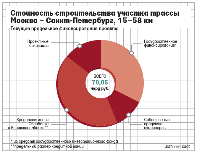 В январе 2015 г. откроется проезд по стартовому участку новой трассы М11 Москва - Санкт-Петербург - 43 км от МКАД по Химкинскому и Солнечногорскому районам. Трасса будет платной, но еще минимум полгода будет работать в бесплатном режиме. Дорогу по концессионному соглашению строит Северо-Западная концессионная компания - совместное предприятие «Мостотреста» (в числе его совладельцев - бизнесмены Аркадий и Игорь Ротенберги) и французской Vinci Concessions. Генподрядчик - сам «Мостотрест». Стоимость проекта - до 70 млрд руб., в том числе госфинансирование - почти 23 млрд руб. (см. график).