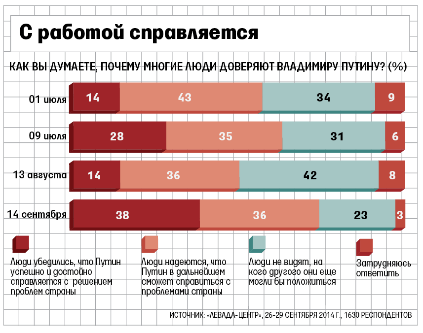 В то, что президент искренне хочет добиться повышения благосостояния населения, но не может этого сделать из-за сопротивления бюрократии и отсутствия хорошей команды, сейчас верит 42% против 33% в мае 2012 г. «Это трогательно и соответствует технике ручного управления и поведению президента: если бы я был там, то сам бы все починил, но бюрократия не дает, чиновники на местах виноваты. Опрошенным не приходит в голову, что эта бюрократия выращена им», - комментирует социолог. По 10-балльной шкале Путин получил в сентябре 2014 г. 7,33 балла - выше эта оценка была только в январе 2008 г. (7,49).
