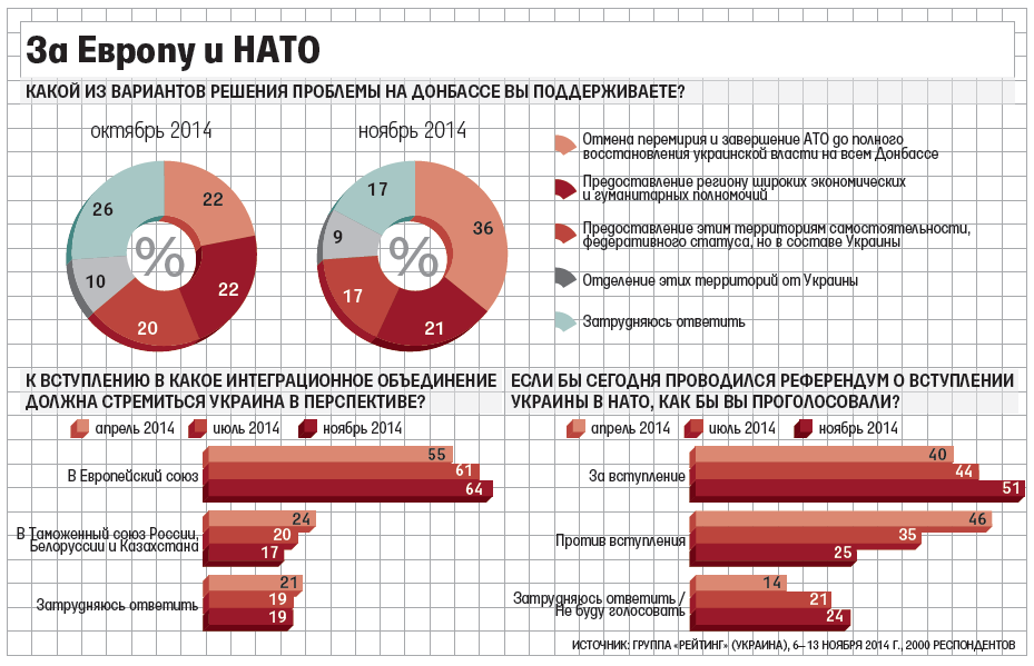 Во внешней политике все больше украинцев хотели бы скорейшего сближения с Западом и США. За вступление в ЕС высказываются 64% граждан - в апреле их было 55%, в июле - 61%. «Тренд один - абсолютное большинство поддерживает вступление в ЕС», - говорит Антипович. Среди голосовавших за президентский «Блок Петра Порошенко» за присоединение к ЕС выступают 84%, за «Народный фронт» будущего премьера Арсения Яценюка - 91%. За это же время доля украинцев, желающих присоединения к Таможенному союзу России, Казахстана и Белоруссии, снизилась с 24 до 17%. Доля украинцев, поддерживающих вступление страны в НАТО, в ноябре составила 51% и впервые за время наблюдения преодолела половину, отмечает директор «Рейтинга». В апреле их было всего 40%, в июле - августе - 44%.
