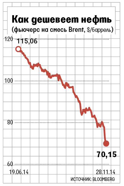 В пятницу цена барреля Brent в ходе торгов опускалась до $69,78, за день - на 3,35% до $70,2, с июня - на 36% (данные Bloomberg, см. график). ОПЕК предоставила рынку решать, какая цена справедлива, уверены аналитики BNP Paribas SA, картель готов жить при низких ценах. ОПЕК рискует наводнить рынок лишней нефтью, но решилась на эксперимент, предупреждает Energy Intelligence. Это ценовая война, считают аналитики Morgan Stanley: «Опасная игра - может ударить по инвестициям в отрасли, в итоге такая тактика обернется шоком для добычи». Стратегия ОПЕК выбьет с рынка производителей с высокими издержками, что в итоге позволит его сбалансировать, рассуждает трейдер: «Это как потрясти сильно фруктовое дерево: часть фруктов упадет».