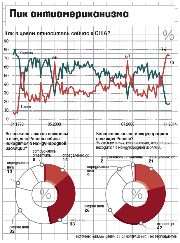 К США очень хорошо или в основном хорошо относятся лишь 18% опрошенных - на 1% больше, чем в сентябре, следует из ноябрьского опроса «Левада-центра», 74% настроены негативно (в сентябре таких было 73%). Слегка улучшилось отношение к Европейскому союзу: положительно отвечают 26% респондентов (на 7% больше, чем в сентябре), отрицательно - 63% (в сентябре - 68%). Снижения антизападных настроений не происходит, они достигли своего пика и такими отрицательными не были еще никогда, поэтому говорить о том, что они сходят на нет, пока рано, объясняет замдиректора «Левада-центра» Алексей Гражданкин. Но это отношение к политике властей, уточняет социолог: «Когда мы спрашиваем об отношении к самим европейцам или американцам, то наблюдаем небольшое ухудшение, но гораздо менее критичное». Обычно при возникновении проблемы отношение к стране резко ухудшается, но, как только все успокаивается, оно также резко нормализуется, подчеркивает Гражданкин: судя по этим данным, резкого скачка назад не происходит, а значит, конфликт все еще в острой фазе.