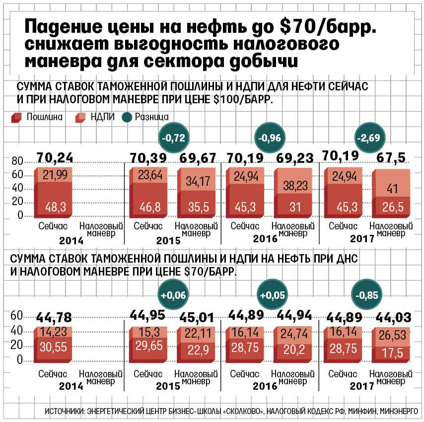 Тогда Минфин придумал налоговый маневр: пошлины и акцизы снижались, а налог на добычу полезных ископаемых (НДПИ) рос. Сначала Минфин хотел провести маневр за два года, потом договорился с отраслью о трех годах.