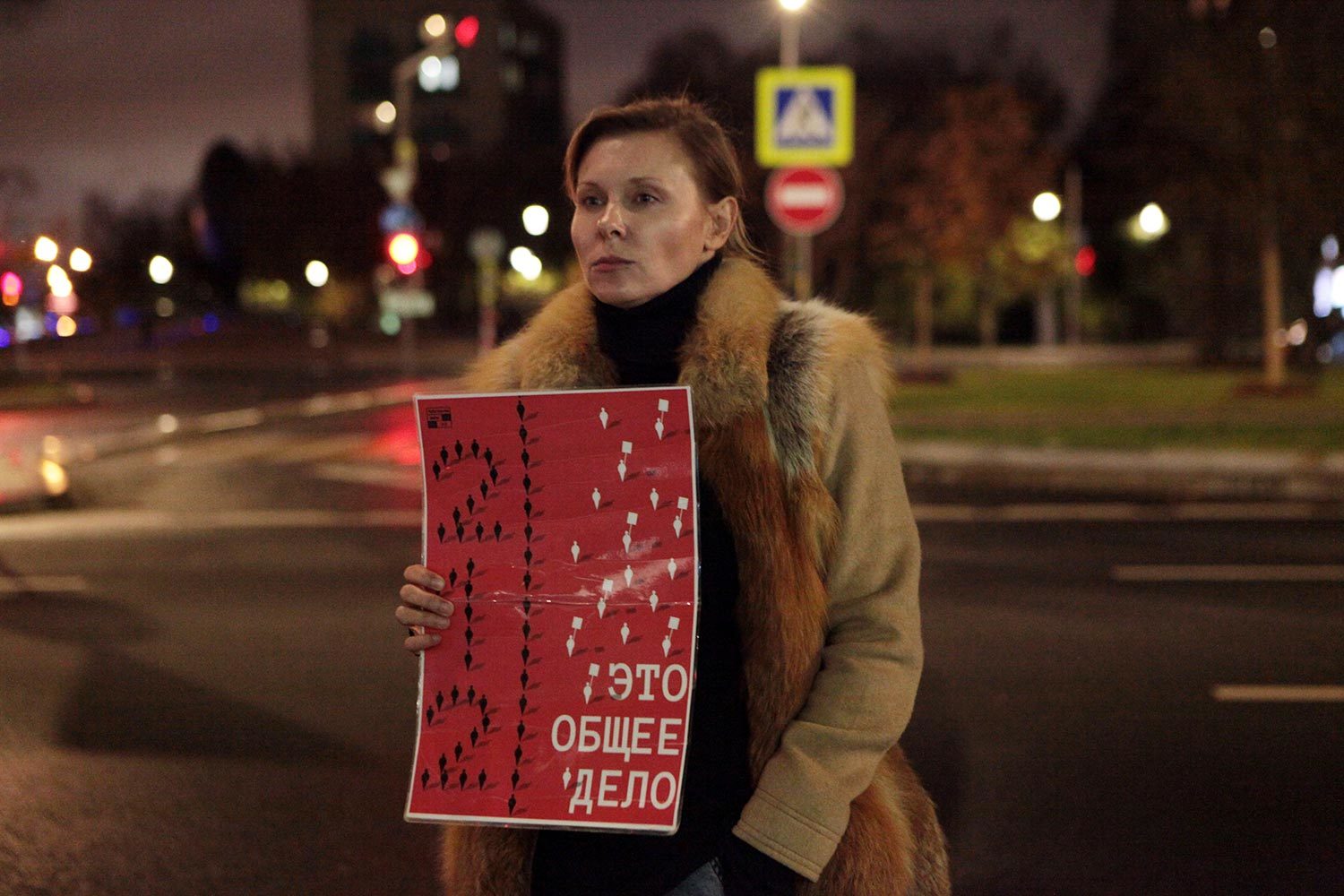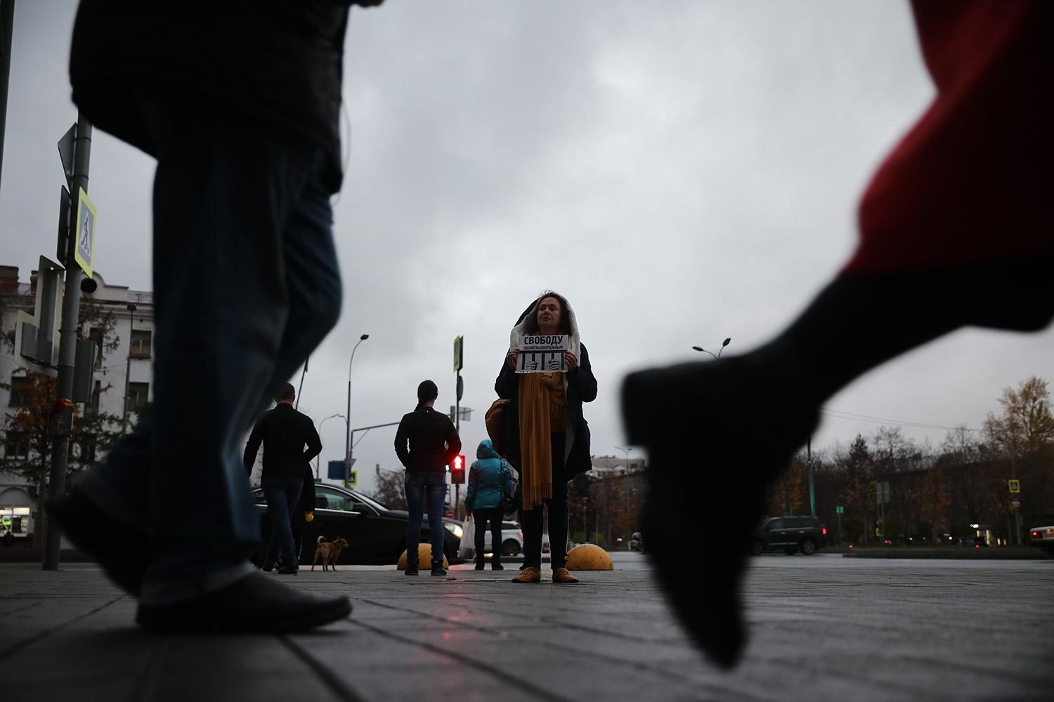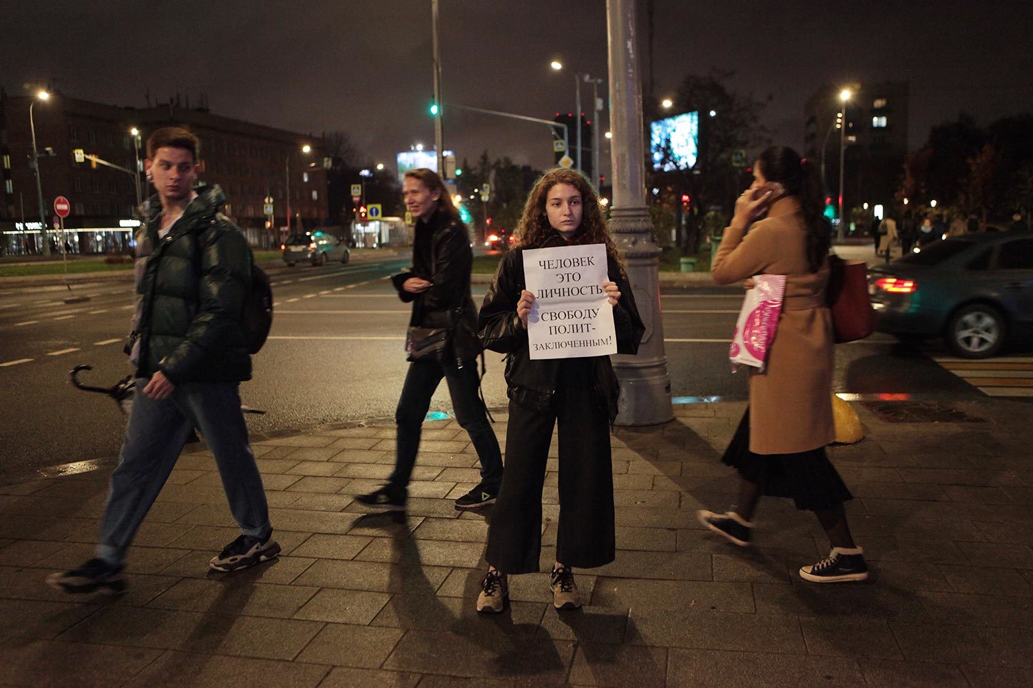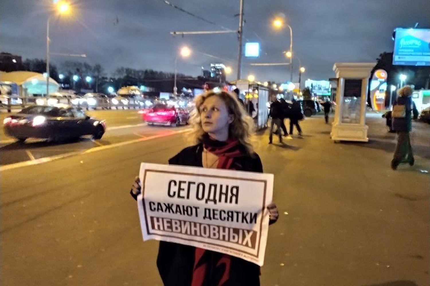 Наташа Шарапова для ВедомостейВ Москве прошли одиночные пикеты в поддержку фигурантов «московского дела», «Нового величия» и «Сети». Пикеты прошли по всей Москве, вдалеке от центра города, на нескольких станциях. В частности, у метро «Выхино», «Академическая», «Петровско-Разумовская» и «Тимирязевская». Всего 17 станций. На фото: актриса Яна Троянова у станции метро «Академическая»
