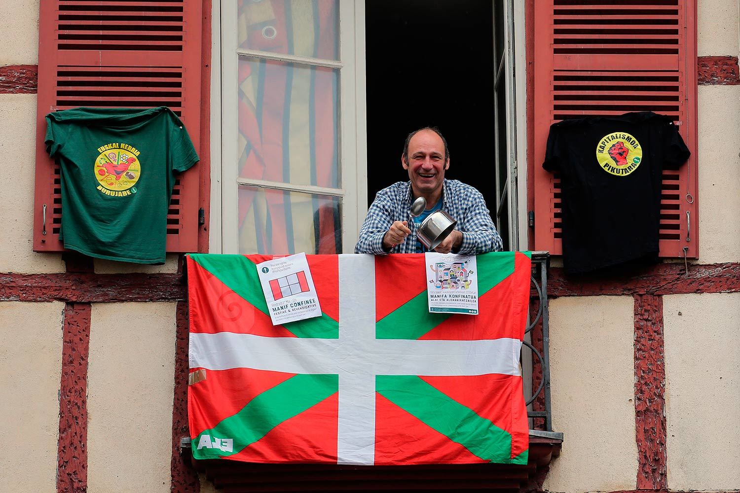Франция, несмотря на запрет любых публичных мероприятий, готовится к общенациональной демонстрации. Профсоюзы призывают людей петь на балконах в защиту прав рабочих. На фото – мужчина с баскским флагом на балконе своего дома в Байонне