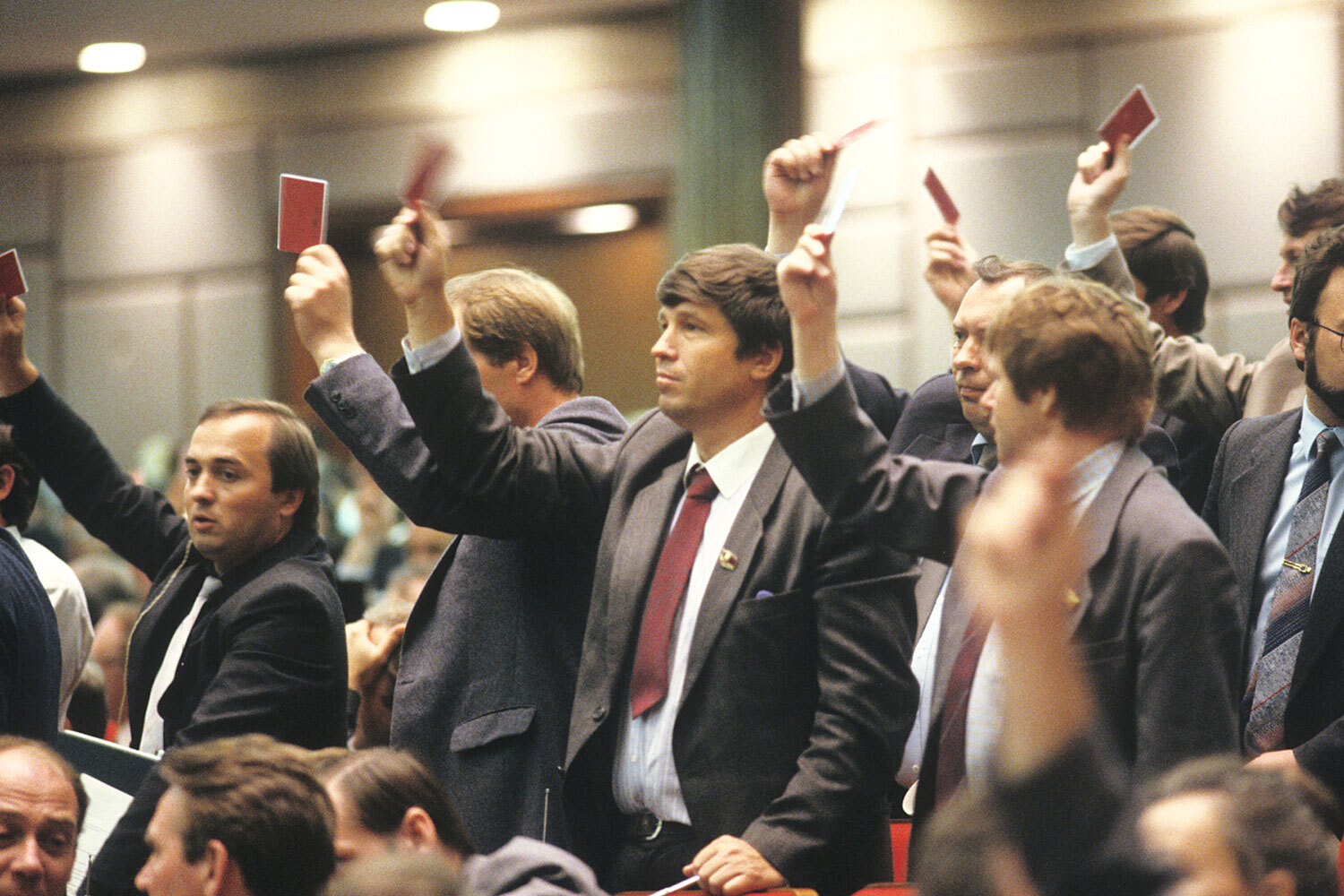 Сергей Гунеев / РИА НовостиПленум ЦК подготовил платформу «К гуманному, демократическому социализму», которая предполагала переход к рыночной экономике, разделение власти, многопартийность и другие реформы. Однако открывшийся съезд вскрыл глубокий раскол между реформаторами и консерваторами. Последние обвиняли руководство КПСС в отходе от коммунистических принципов, критиковали генсека Михаила Горбачева (на фото) за поспешный переход к рыночной экономике и призывали его уйти в отставку. Впрочем, на альтернативных выборах его снова избрали генсеком (3411 голосов за и 1116 против).