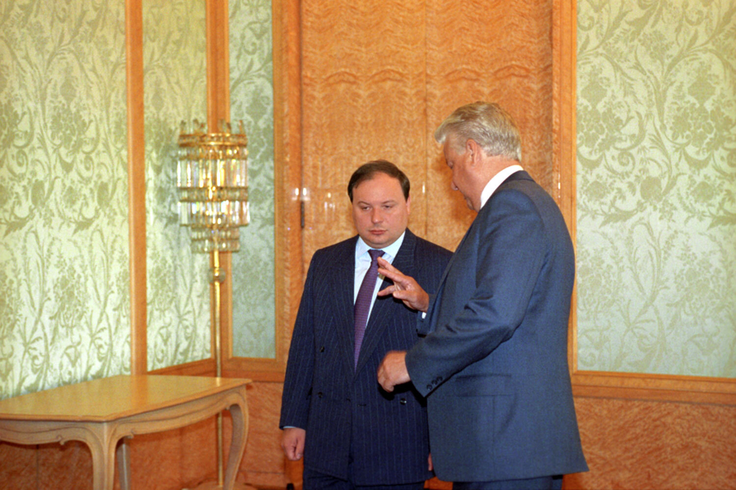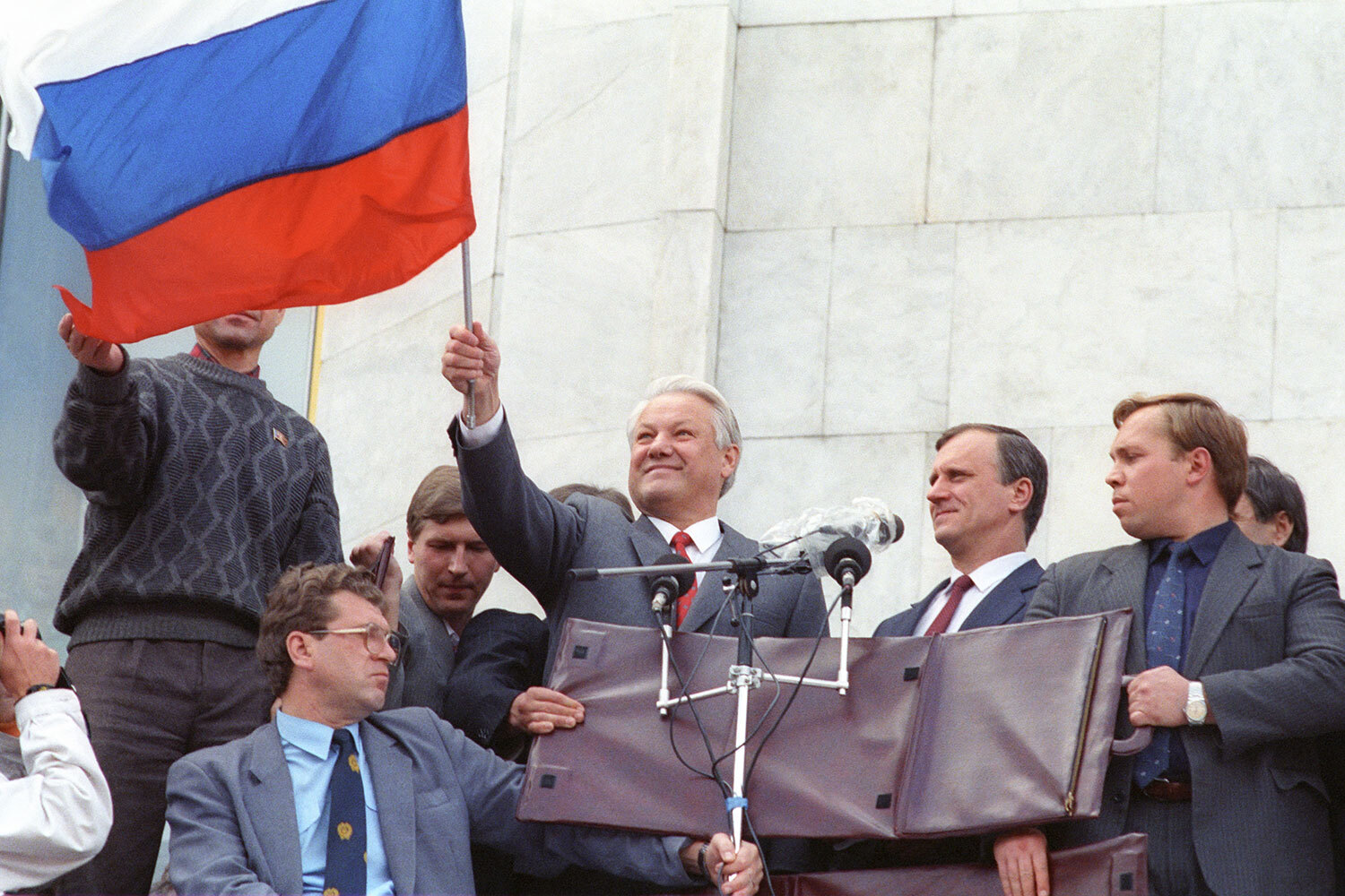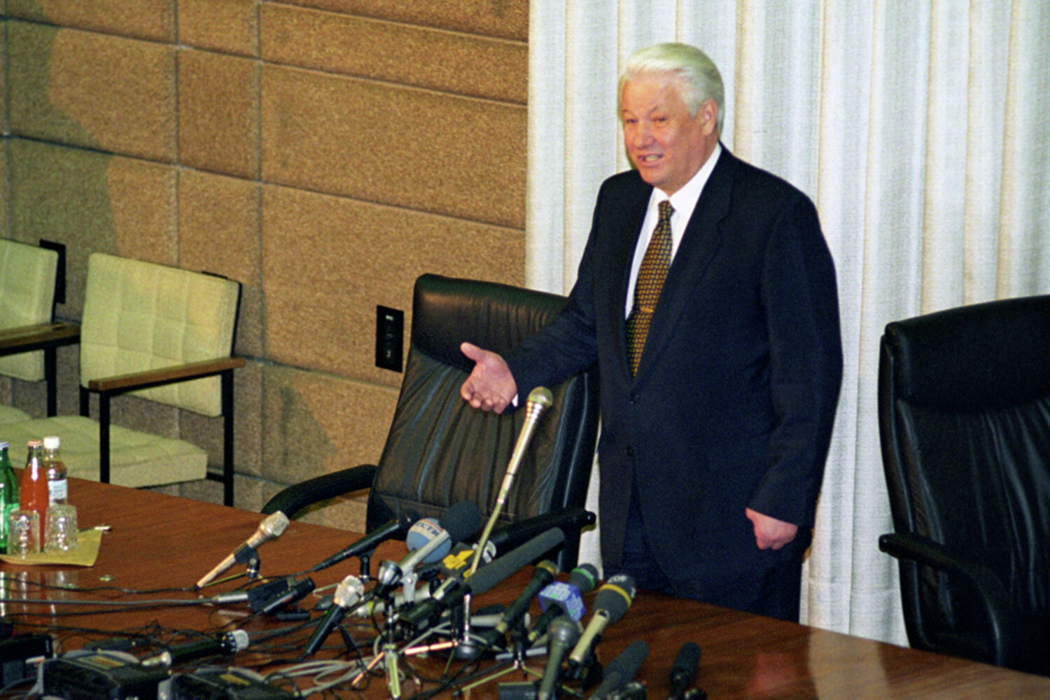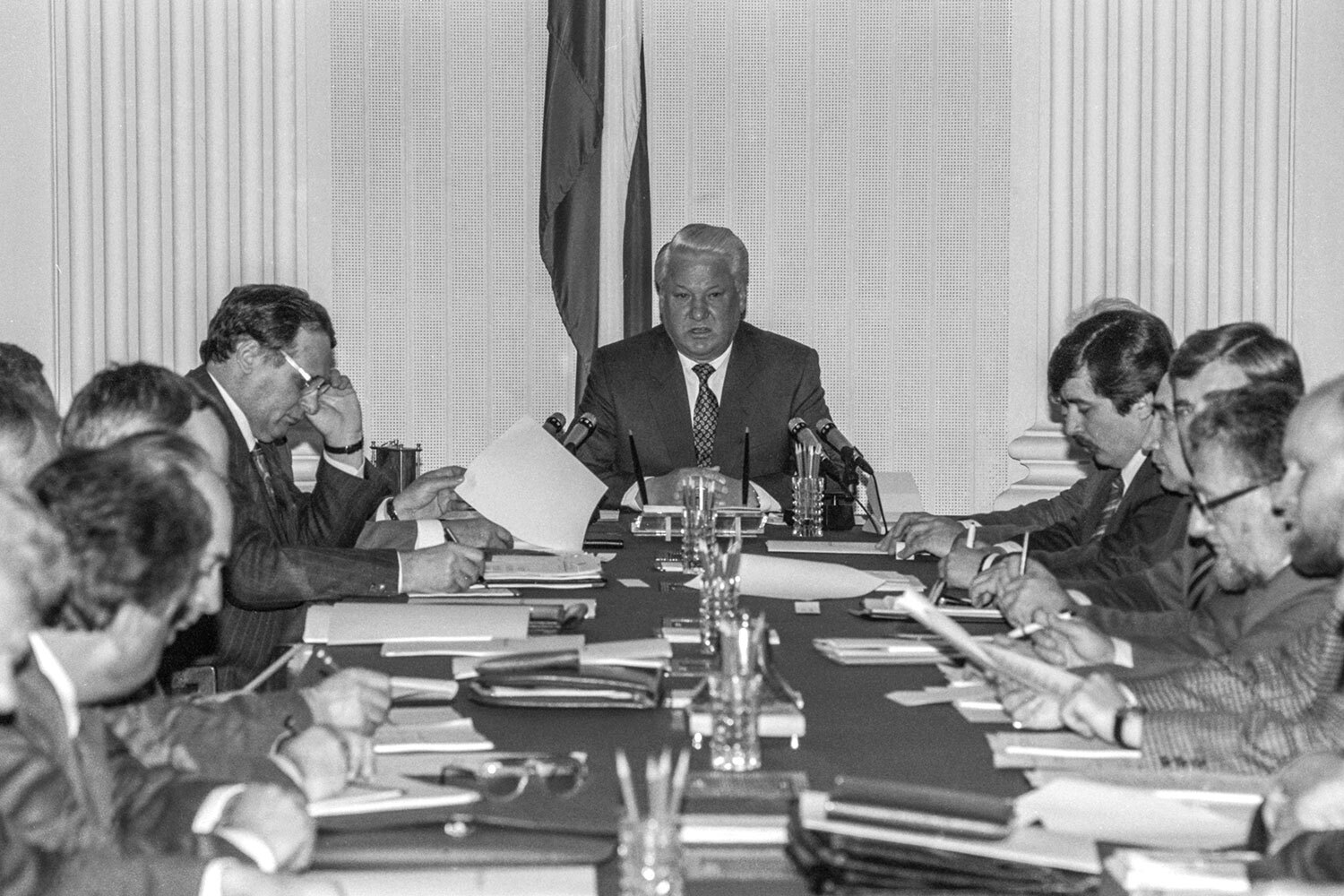 Сенцов Александр, Чумичев Александр / Фотохроника ТАССВ 1993 г. в России разразился конституционный кризис, вызванный борьбой за власть между Ельциным и Верховным Советом. Противостояние достигло кульминации, когда 21 сентября президент подписал указ № 1400 «О поэтапной конституционной реформе», предусматривавший роспуск парламента. Несмотря на решение Конституционного суда, признавшего действия Ельцина противоречащими Основному закону, силовики остались на стороне главы государства. В результате Белый дом был взят штурмом, а председатель Верховного Совета Руслан Хасбулатов и вице-президент Александр Руцкой арестованы. В декабре 1993 г. была принята новая Конституция РФ, усилившая президентскую власть, а также учрежден новый двухпалатный парламент, состоящий из Государственной думы и Совета Федерации.