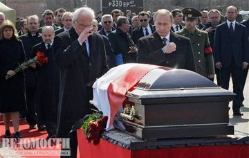 Владимир Путин и польский посол в России Ежи Бар, стоять рядом с гробом президента Польши Леха Качиньского во время церемонии прощания в аэропорту Смоленска.