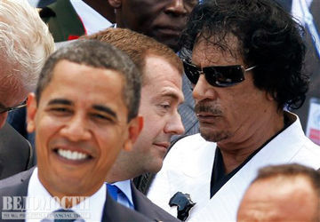 Экс-президент РФ Владимир Путин и Муаммар Каддафи во время встречи. Ливия, Триполи, 2008 г.