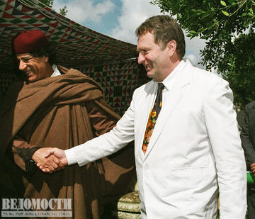 Муамар Каддафи приветствует лидера КПРФ Жириновского. Ливия, шатер Каддафи, 1995 г.