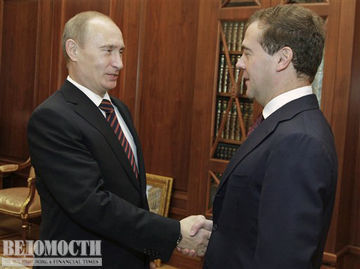2009 г. Дмитрий Медведев поздравляет Владимира Путина с днем рождения.
